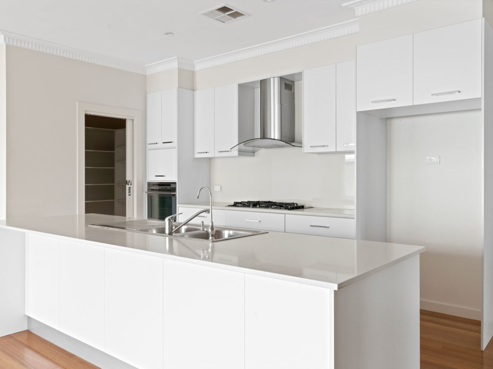 - Designer kitchen features an island bench with Caesar Stone top, a 5 burner gas cook top, pyrolytic oven and dishwasher, plus walk in pantry