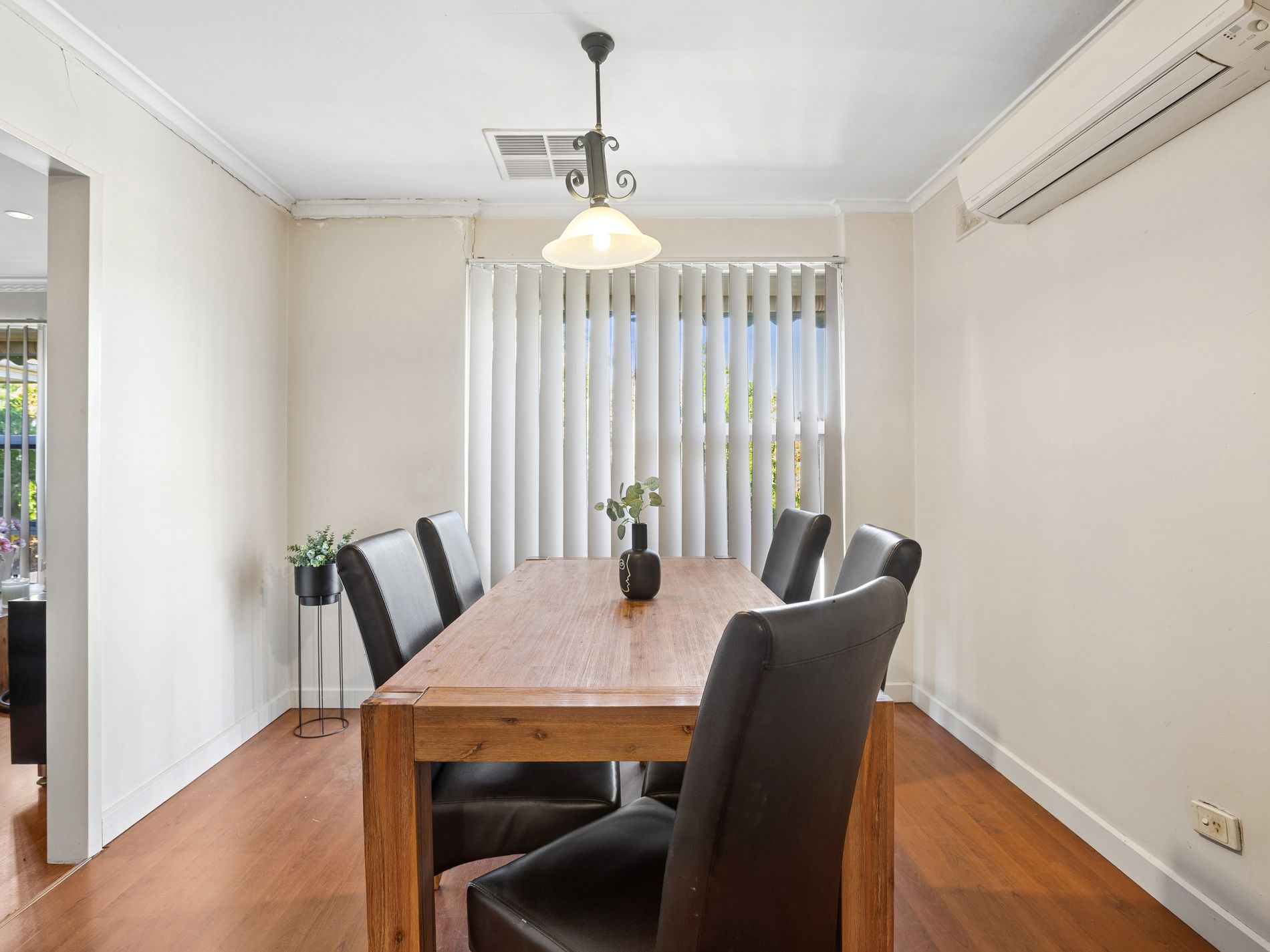 - The lounge flows into a combined kitchen and dining room with an air conditioner, pendant light and panelled cupboard